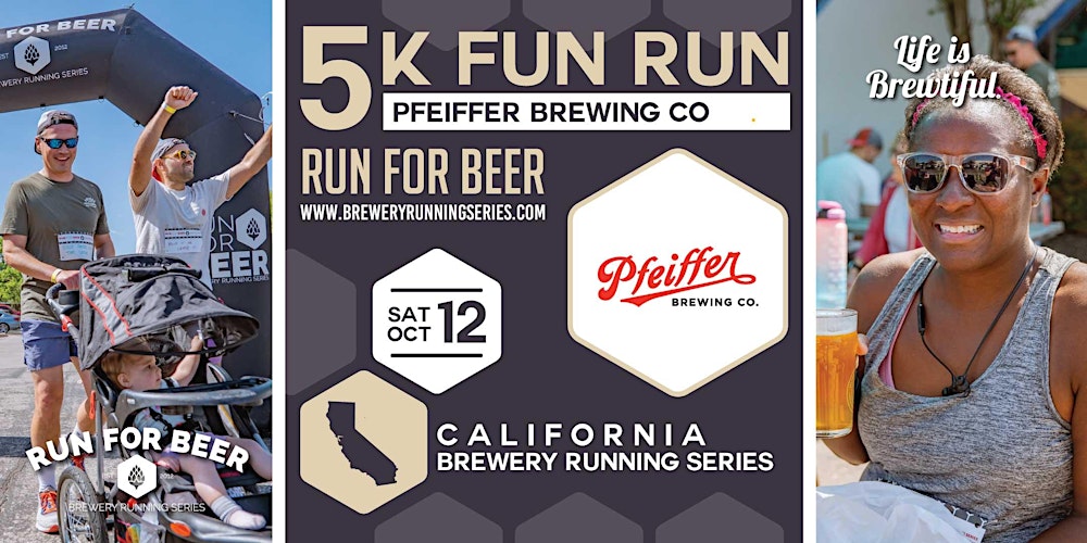 Join us – the California Brewery Running Series™ race for fun run courses that all start and end at local breweries. A portion of all proceeds support local nonprofits. Join us for 5k Fun Run event at Pfeiffer Brewing Co. Run, walk or jog a 5k course, then celebrate at the finish line!