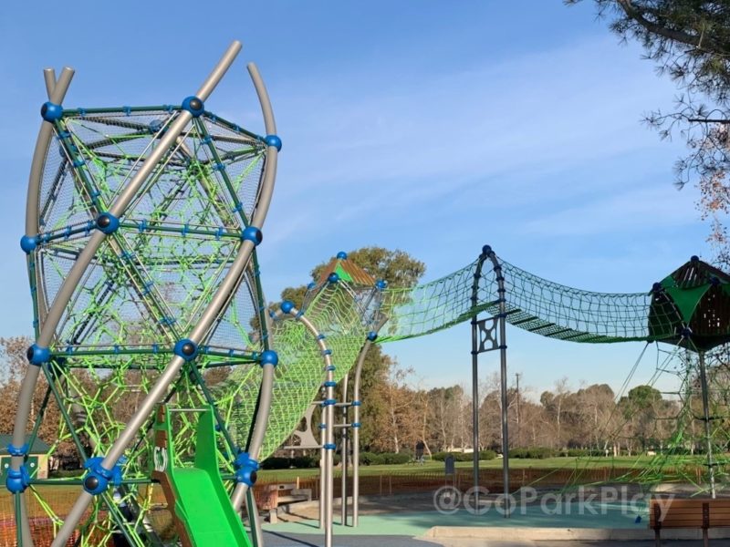 Huntington Beach Central Park has a large play area, kids zipline, extensive rope climbing course, trail that leads you around the lake – fishing there, this part is not stroller friendly as it goes close to the water and has lots of dirt and roots to walk over, sisc Golf course runs near the playground and more.