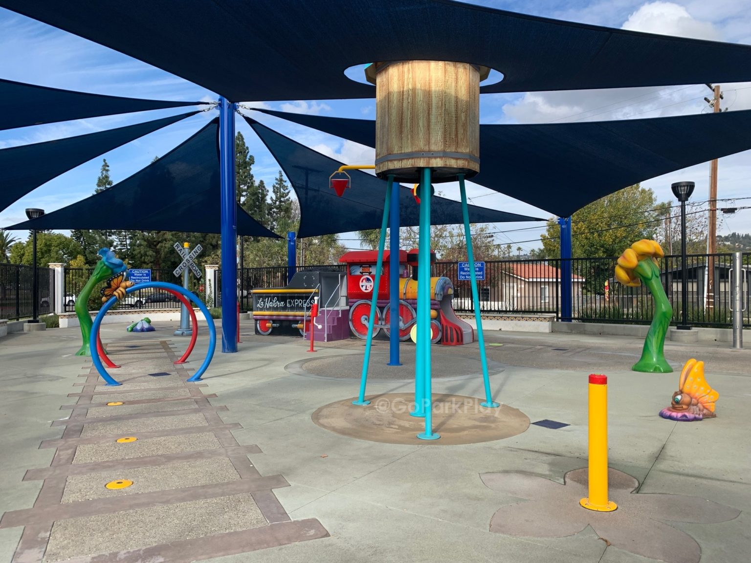 Brio Park splash pad is a shaded playground with slides right next to the splash pad, covered picnic tables, BBQ & restrooms.