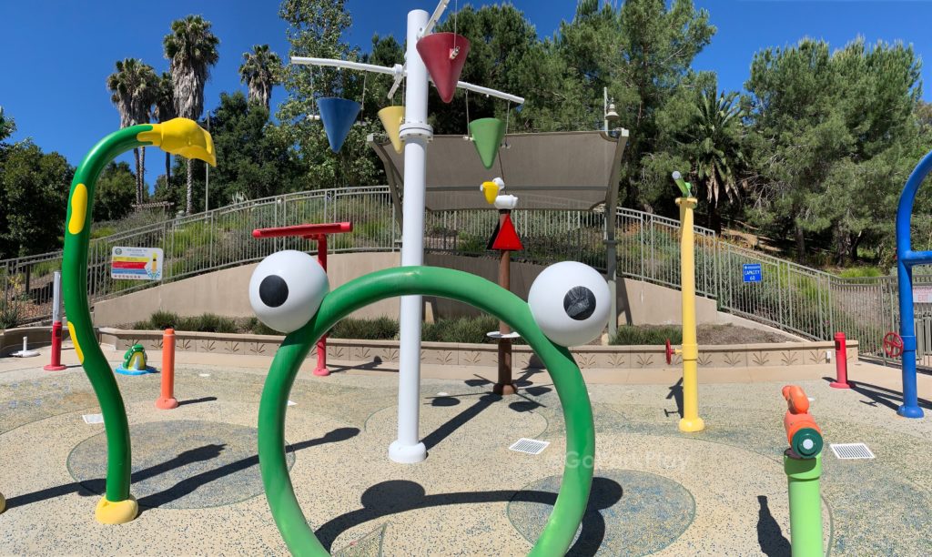 Crown Valley Park playground is nature themed with boulders and slides, splash pad, picnic tables, restrooms.