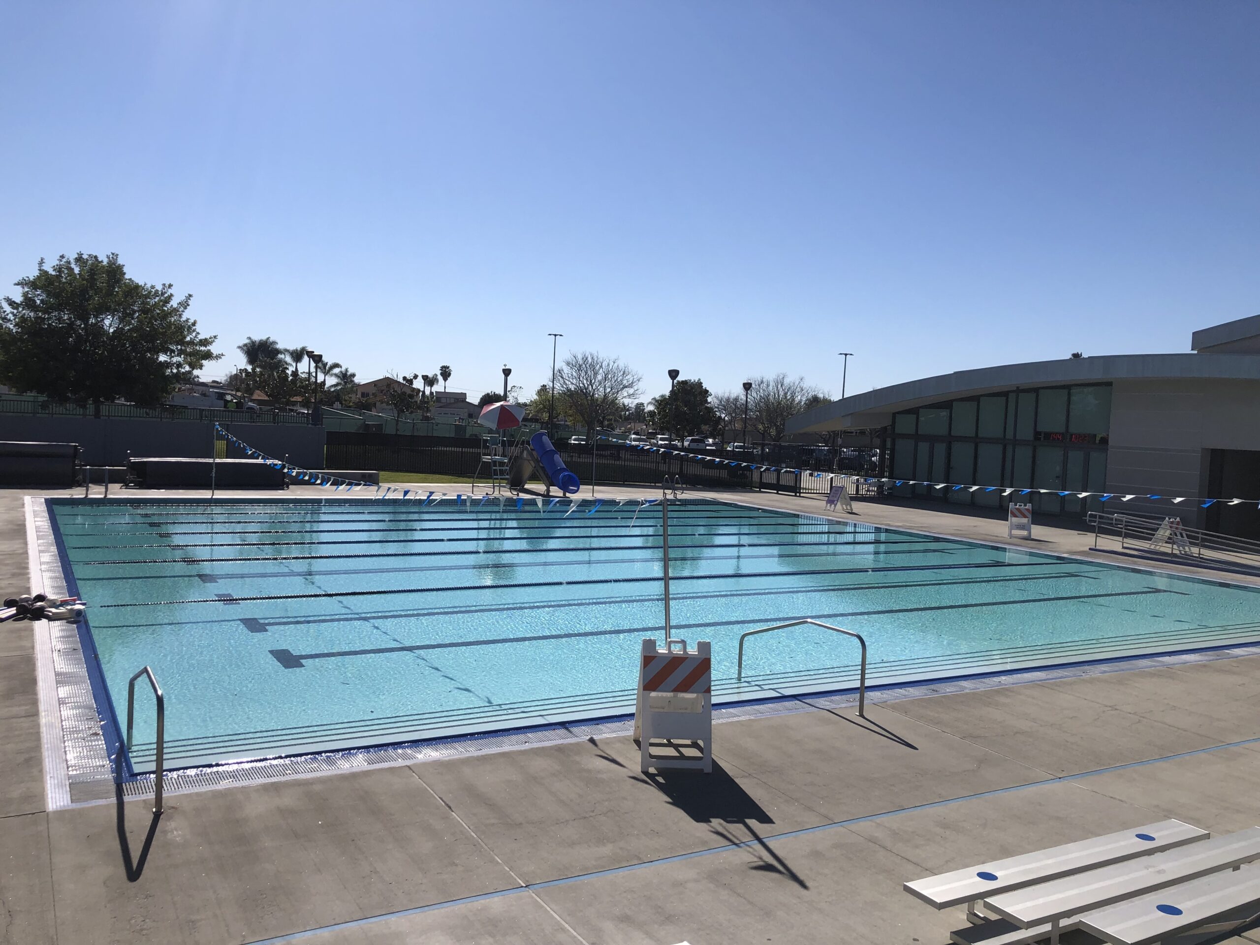 Recreational swimming is open to all ages. Children 5 years and younger must be accompanied by an adult, one-on-one, in the water at all times. All participants that would like to explore the deep end, use the water slide, diving pool and diving boards will need to pass a swim test.