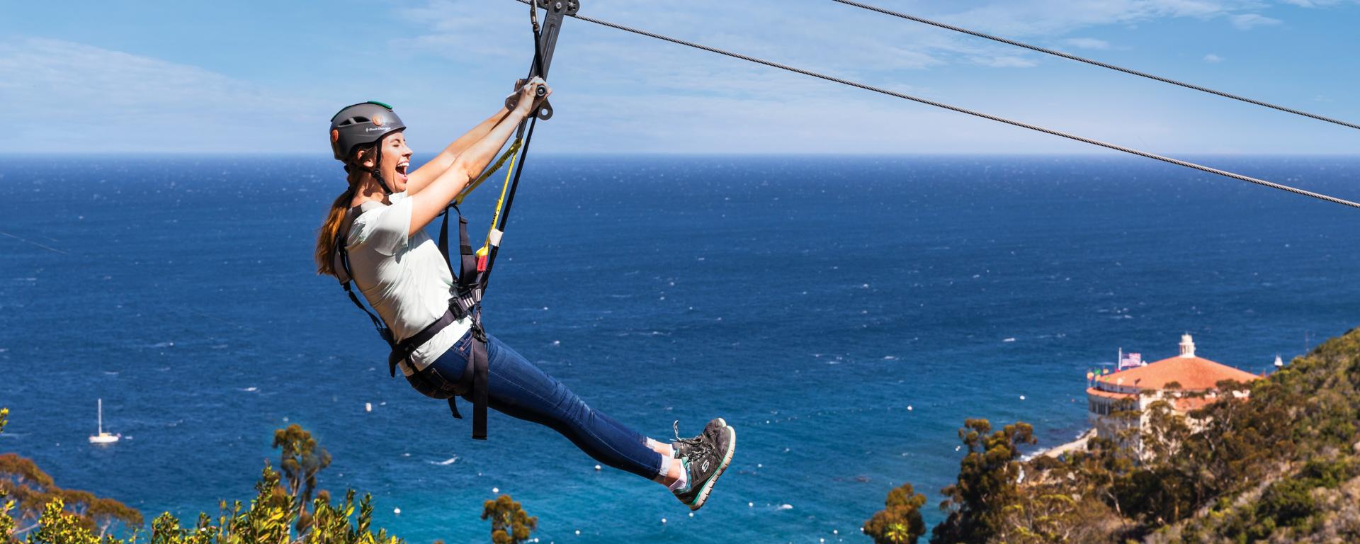 from Long Beach, San Pedro or Dana Point, and two hours of adrenaline-fueled fun on the Catalina Island Zip Line Eco Tour , where you’ll soar high over Descanso Canyon and through a grove of towering eucalyptus trees on five separate lines totaling nearly three quarters of a mile at speeds approaching 35 mph. After the zipping’s done, head down to